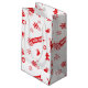 Una bolsa de regalo con una repetición sin costuras roja de elementos Navidades -medias, pan jengibre, copos de nieve, reno, adornos navideños, velas, árbol de Navidad y las palabras "Feliz Navidad"- en ilustracion.