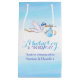 Una cigüeña de una ducha de bebé con un bolso de regalo azul para un bebé. Ideal para un bebé especial que duela de un fiesta o evento. Personaliza con tu propio mensaje de agradecimiento y nombres. Ideal para un favor especial / y/o regalos para agradecerles a los invitados o a la familia por ayudar. Arte y diseño original de la acuarela por Sarah Trett para www.mylittleeden.com