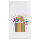 Naranja gato tabby asomando una caja de regalo a rayas de arcoiris con un arco dorado, un confetti, una correa y listo para el fiesta. Causa celebrar cumpleaños, festividades o ocasiones especiales. Arte de Margaret Loftin Whiting.