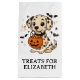 Esta tierna y personalizada bolsita de regalo de la fiesta de Halloween incluye un adorable cachorro dálmata con murciélagos y una calabaza de linternas en cada lado. Personalice el frente y la parte posterior con su texto especial. Diversión por la decoración de tu fiesta de vacaciones.