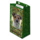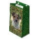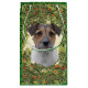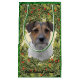 Retrato lindo Jack Russell Terrier centrado en una corona de Navidades verdes con bayas rojas destacadas.