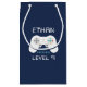 Diseñado para coincidir con nuestras invitaciones y accesorios de la fiesta de cumpleaños Level Up, esta bolsa de regalo con temática de gamer retro incluye un ilustracion de controlador de juegos en un fondo azul marino con "[Name] ha alcanzado el nivel [age]" en letras de estilo digital vintage.