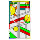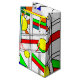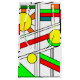 Esta bolsa de regalo tiene un diseño moderno de mediados de siglo, con una apariencia de vidrio teñido con líneas negras y círculos llenos de colores primarios y secundarios.
