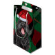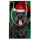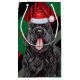 A los amantes del perro les encantará recibir o regalar esta linda y divertida bolsa de regalos navideña con un adorable perro del Terrier Ruso Negro con un sombrero de Santa sobre un fondo rojo y verde estacional con estampado.