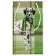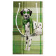 Un perro dálmata de moda está vestido para las vacaciones con una bufanda de invierno verde y gafas de sol frescas y acompañado de un patrón de manchas en tonos verdes.