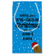 Adorable linda linda y feliz patata personalizado marrón usando un sombrero de Santa Cruz rojo y blanco. La papa tiene un estilo de arte personalizado y marrón de colores, brazos y dedos pegados y una gran sonrisa feliz con puntos para los ojos. El sombrero de Santa en la cabeza es rojo con un guarnecido blanco y una pompa blanca colgando. Está dentro de una forma ovalada azul claro con un marco azul oscuro y dos hojas verdes y huecas con dos bayas rojas en la parte superior del oval. El color de fondo es un azul claro brillante con copos de nieve blancos flotando a punto de dar un toque festivo a estas bonitas bolsas de regalo de temporada. En la parte posterior del bolso hay plantillas de texto para salir como están o reemplazar el texto con su propio mensaje Y agregar sus nombres.