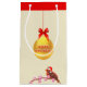 Hermosa bolsa de regalo con una gran pelota de Navidades dorados y Navidades, pequeño pájaro con fondo beige claro.