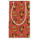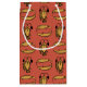 Una pequeña bolsa de regalo de moda, con un patrón de motivos tradicionales egipcios, pescados y cocodrilos, en un fondo rojo rusto. Este patrón, que forma parte de la colección "egipcia" de Posh y Painterly, se puede ajustar fácilmente para que se ajuste a cualquier bolsa de regalo.