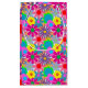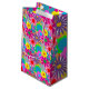 Esta bolsa de regalo tiene un diseño de flores de los años 70 de varios colores.