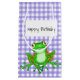 Rana verde dulce en el patrón de gingham púrpura y blanca con burbuja de habla por cualquier cumpleaños de edad. El texto se puede editar.