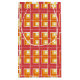 Esta bolsa de regalo tiene un diseño geométrico de L's en rojo, naranja y amarillo, colocado en diferentes direcciones en un campo de blanco.