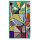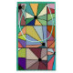 Esta bolsa de regalo tiene un diseño abstracto hecho de nueve cuadrados con un círculo y "rayos" saliendo del círculo en muchos colores diferentes.