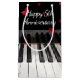 Teclado de piano con texto de 5º Aniversario y pétalos de rosa rojo sobre negro. El texto es editable.
