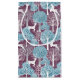 A bright modern abstract pattern with white deer leaping and prancing against a purple background filled with turquoise blue and white trees.