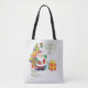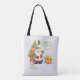 Esta es una bolsa de tote festiva con una alegre santa con regalos, parado al lado de un hermoso árbol de navidad decorado.