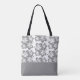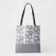 Esta bolsa de tote se muestra con un diseño de impresión de flores tropicales tiernas en un color gris sobre un color de fondo blanco con una tira de acento gris en la parte inferior. Tamaño medio mostrado. Tiene correas negras. Personalizar este artículo o compra tal cual.