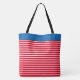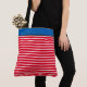 Este bolso de tocador se muestra con un divertido diseño de rayas rojas y blancas con un panel superior de color azul marino. Se muestra un gran tamaño. Tiene correas negras. Personalizar este artículo o compre como está diseñado.