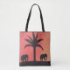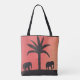 Esta bolsa de tocador está diseñada con mi representación de dos elefantes y una silueta de palmera contra un cielo naranja al atardecer.