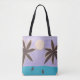 Esta bolsa de tocador está diseñada con una representación mixta de palmas de silueta contra un cielo de lavanda.