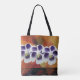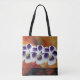 Elegante diseño escandinavo. Flores y fondo abstracto, tote de moda. Flores moradas y blancas, fondo amarillo, rojo, marrón.
