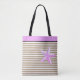 Esta bolsa de tote se muestra en unas tiras de color de arena lindas y un gran diseño de huellas de pez estrella rosada con la banda superior rosada coordinadora. Mangos de correa negra. Se muestra un gran tamaño. Personalizar este artículo o compra tal cual.
