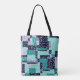 Tote tus cosas con estilo con una linda bolsa de cuerpo cruzado o un tote de hombro con un divertido patrón abstracto de cubos y petardos en tonos verdes, púrpura, negro, gris y blanco. Original obra de arte de la ropa y los coleccionables de Buttercup.
