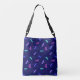 El tote de patrón de libélula multicolor presenta libélulas en púrpura lavanda, rosa fuschia, aqua y azul índigo, en vuelo a través de un fondo azul índigo profundo. Disponible en diferentes colores.