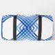 Líneas azules de cinco sombras Oscuras a la luz, de abajo a arriba. Dos conjuntos de rayas se colocan diagonalmente, reuniéndose en el centro de la parte superior e inferior de la bolsa a cada lado. Estos dos conjuntos se replican y giran, de manera que se cruzan. Los paneles de fondo son el color azul más oscuro.