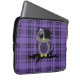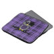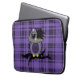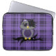 Personalizado Neoprene Portátil Sleeve de 13 pulgadas con un diseño de arte vectorial de una linda lechuza emo morada, gris y negra con el pelo y el arco de un cráneo morado sentado en una rama con un corazón roto y un fondo de manto morado.