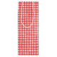 Chica de garrote con pelo, zapatillas, vestido de gingham, gafas rojas, collar de perlas y sosteniendo un vaso de vino tinto con fondo blanco. El patrón de fondo de Gingham está bloqueado.