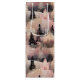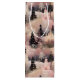 A delicate pink and black pattern with snowy hills and ethereal village buildings among elegant pink and black pine trees.
