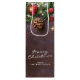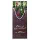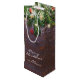 Bolsa de regalo de navidad de vino con fondo rústico de madera, ramas de árboles de navidad, decoración de árboles rojos y dorados, conos de pino y luces de cuerda.