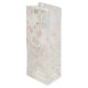 Una bolsa de regalo de vino para Navidades festivos. El fondo es un collage de estilo vintage con una imagen descolorida de rosas rosadas, hojas verdes y escritura francesa. Encendido sobre la parte superior, hay un ramo de navidades de bonito y un caballo victoriano mecedor rodeado de peonías y postes rosados de bonito.