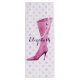 Moda de Stiletto - acuarela estilo imagen de una bota de tacón de estilete rosa púrpura moderna adornada con 3 botones, colocada sobre diferentes puntos de polka púrpura pálido y malva. Utilice la plantilla para personalizar con su nombre o mensaje en el tipo de letra de guión púrpura berenjena.