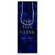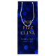 Elegante bolsa de regalo de vino con las palabras "Pop Fizz Clink" en falso Relieve metalizado de oro contra un fondo de color azul zafiro de las luces de bokeh. Perfecto para fiestas de compromiso, bodas, aniversarios u otros eventos.