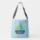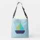 Imprima una bolsa de té con un diseño de rayas náuticas brillantes y divertidas de azul y blanco con veleros en frente y detrás de azul, agua y verde con un área que puede añadir un nombre para personalizarla!