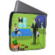 Esta bolsa de ordenadores Personalizados urbanos retro cuenta con el dibujo personalizado de un apartamento de estilo penthouse con una decoración elegante y vistas a un horizonte urbano. El apartamento cuenta con un suelo verde y una pared de ladrillo verde. En la pared hay cuatro pinturas de tela estiradas clásicas de la película Martini, también disponibles en la tienda Zazzle de StrangeLittleOnion (¡insinuación!). Tres de las impresiones tienen un fondo turquesa y una está sobre un fondo negro. Debajo de las estampas de lona, hay un sofá moderno azul de mediados de siglo. En el sofá hay una bonita y sofisticada belleza de pelo cuervo. Ella lleva un vestido clásico, pequeño, negro con un corpiño rosado caliente. En el lado opuesto de la habitación hay un hombre agradable, alto, oscuro y guapo. Lleva traje negro, camisa blanca y corbata verde. De un lado, él está sosteniendo un álbum de discos de vinilo y, de otro lado, está sosteniendo una portada de un álbum divertido. En el suelo, un otomano naranja sostiene un récord de jugador verde y negro. La portada de otro álbum, apuntada contra el otomano, tiene un disco que sale de un costado. También hay tres álbumes de vinilo coloridos diseminados por el suelo. Detrás del hombre, podemos ver a través de las puertas correderas de cristal un balcón verde. Un gato blanco vestido con un collar rosado está encaramado en el borde del balcón. Más allá del gato, hay un impresionante horizonte urbano con rascacielos y una luna creciente amarilla. Si así es como vive la otra mitad, ¡inscríbeme!