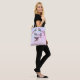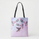 Personaliza este Hummingbird único "uno de bondad" y la bolsa de flores. Se trata de un gran colibrí que toma el néctar de hermosas flores rosadas y púrpuras sobre un fondo rosa y azul en el frente... ¡y flores rosadas y moradas en la espalda! Pintura original Bella Artes del artista Kerry Miller.