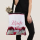 Esta bolsa tote de hombro se muestra con un diseño de impresión de peonías rojas y blancas. Texto de Novia en la parte delantera y trasera, pero puedes cambiarlo a lo que prefieras.