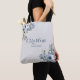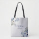 Bolsa Totebag Personalizada Novia Tribal con diseño acuarela floral en azul polvoriento, gris y blanco. La parte posterior tiene una impresión floral general. ¡Asegúrate de visitar mi tienda para ver toda la colección de bodas!
