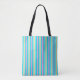 Un patrón de rayas finas colorido en aqua, azul, rosa y dorado. Esta es una bolsa de mano de calidad que tiene una asa negra.