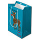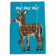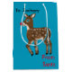 Festividad De Nombre Personalizado De Santa. El personaje festivo de caricatura Super Snow the Blue-Eyed Reindeer botón rojizo con su nariz roja con pedazos de azul, y puntos blancos en su pelaje moreno. ¡Es el bulto más joven de Santa Claus esperando unirse a su trineo algún día! Diseño original de obras de arte © 2016 TamiraZDesigns.