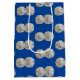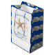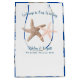 bolsas de bienvenida bodas con diseño de estrella y dólares de arena. Dos estrellas del mar en el frente sobre blanco, con texto azul oscuro. El texto "Bienvenidos a nuestro boda" está ligeramente curvado en la parte superior. Los nombres y la fecha con ubicación están debajo de la pareja de estrellas. La parte posterior y lateral de la bolsa son azul oscuro con un patrón de dos dólares de arena de aspecto realista.