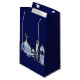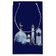 Bolsas de regalo con ilustraciones azules y doradas sobre fondo azul real. Estas elegantes bolsas de regalo con tema de Las mil y una noches se personalizan fácilmente para su evento añadiendo texto o cambiando el tamaño y el color de fondo.