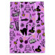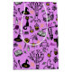 Bolsas de regalo con un diseño minimalista moderno para Halloween, un patrón de siluetas de una escoba, búho, telaraña, silueta de gato, bruja sobre un fondo rosado.