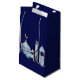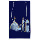 Bolsas de regalo de las noches árabes con hermosos ilustraciones azules y dorados sobre un fondo azul real. Estas elegantes bolsas de regalo de temas de la noche árabe se personalizan fácilmente para tu evento añadiendo texto o cambiando el tamaño y el color de fondo.