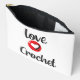 Una bolsa para que un croqueter lleve la novedad que usó para el crocheting, como ganchos y cinta para medir. letras grandes rojas y negras y un corazón. "Love 2 Crochet"