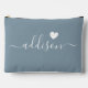 Esta elegante bolsa de accesorios cuenta con un elegante fondo azul polvoriento adornado con un moderno tipo de letra de guión con un nombre personalizado y un encantador diseño cardíaco. El color suave, femenino y la sofisticada tipografía lo convierten en un accesorio perfecto para las damas de honor o para quien aprecie la moda y los diseños de moda. Su uso versátil y su toque personalizado añaden un elemento especial a esta hermosa pieza.