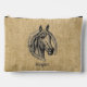La bolsa de cosmética perfecta / accesorio de viaje para los amantes del caballo. Ilustracion de estilo cameo vintage de un caballo con marco herradura. Fondo de textura Burlap. Personalización con nombre o monograma