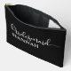 "Este accesorio de dama de honor / equipo de la novia y neceser muestra una fuente de escritura blanca elegante con florituras elegantes en un fondo negro limpio. Es el regalo perfecto para tu dama de honor, diseñado para contener maquillaje y pequeños artículos esenciales. Tradicionalmente presentado en la cena de ensayo, esta bolsa de aseo será útil durante esas primeras horas antes de la boda."